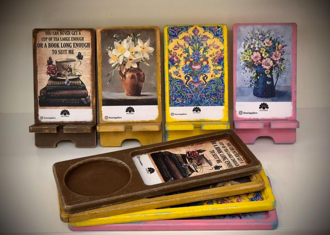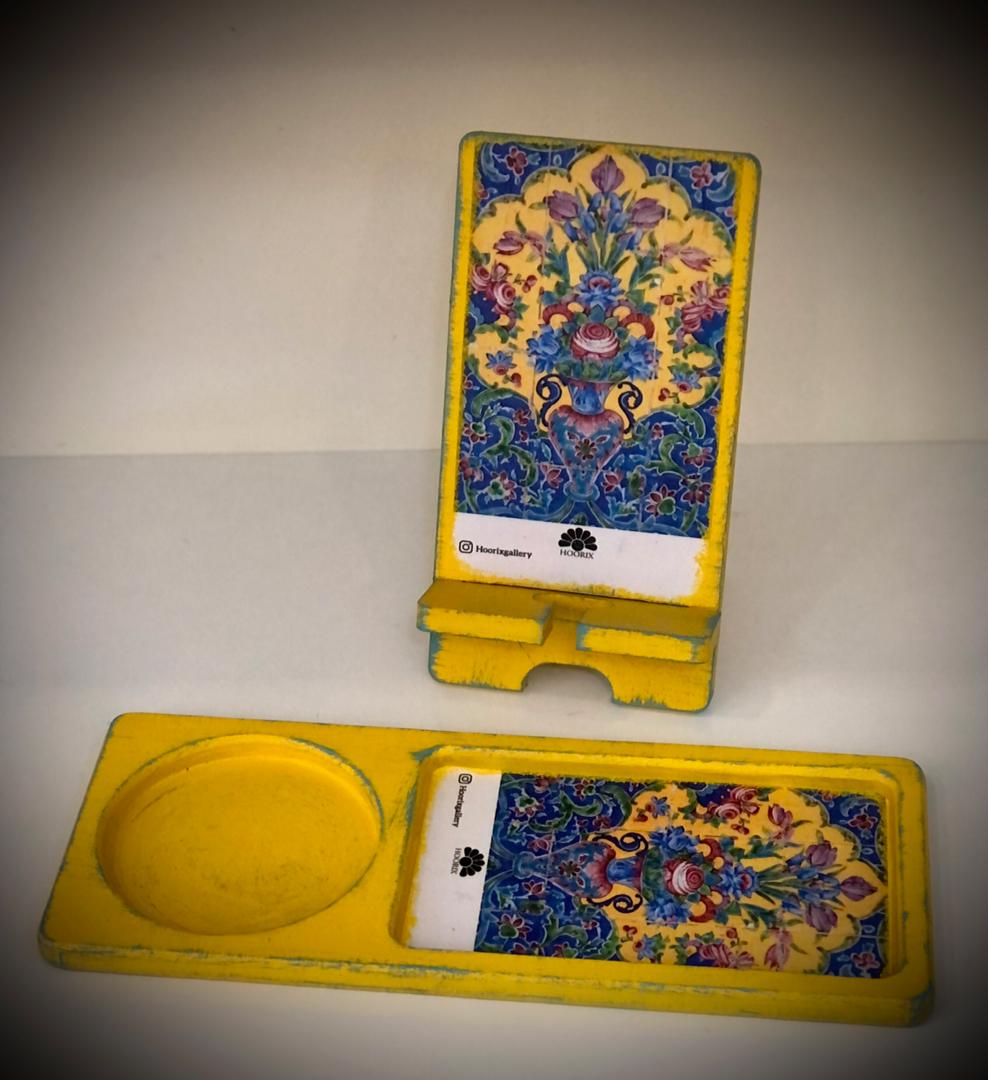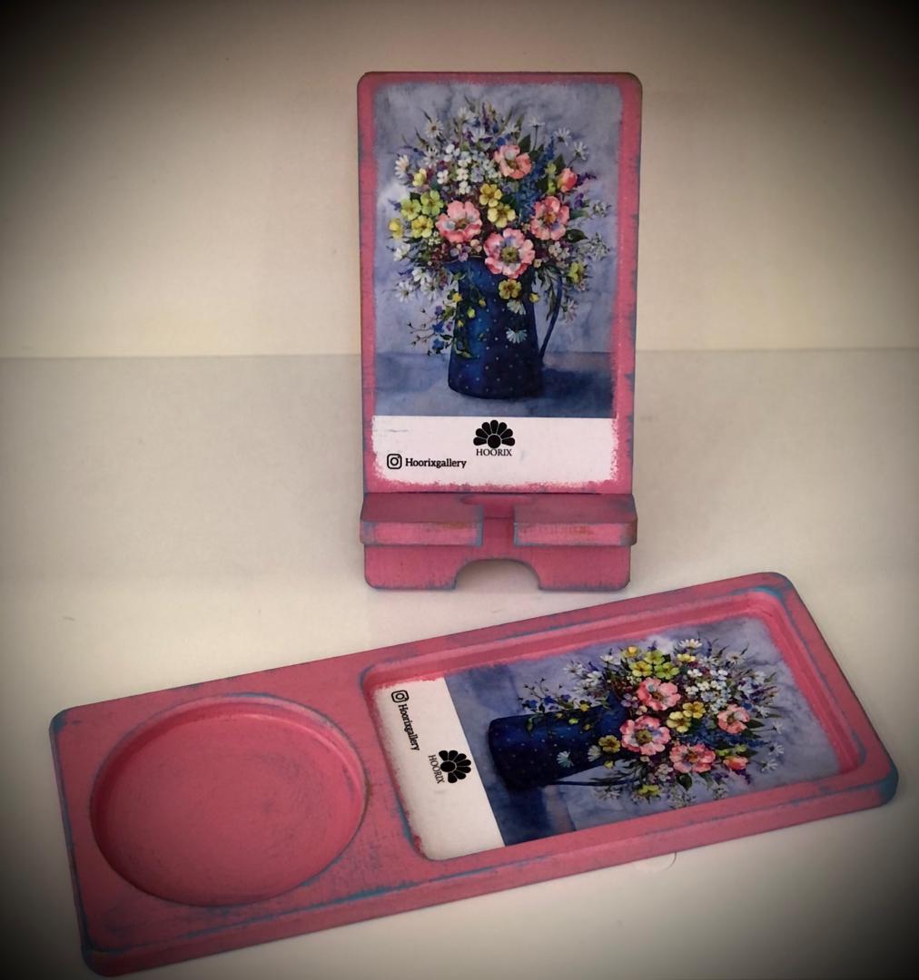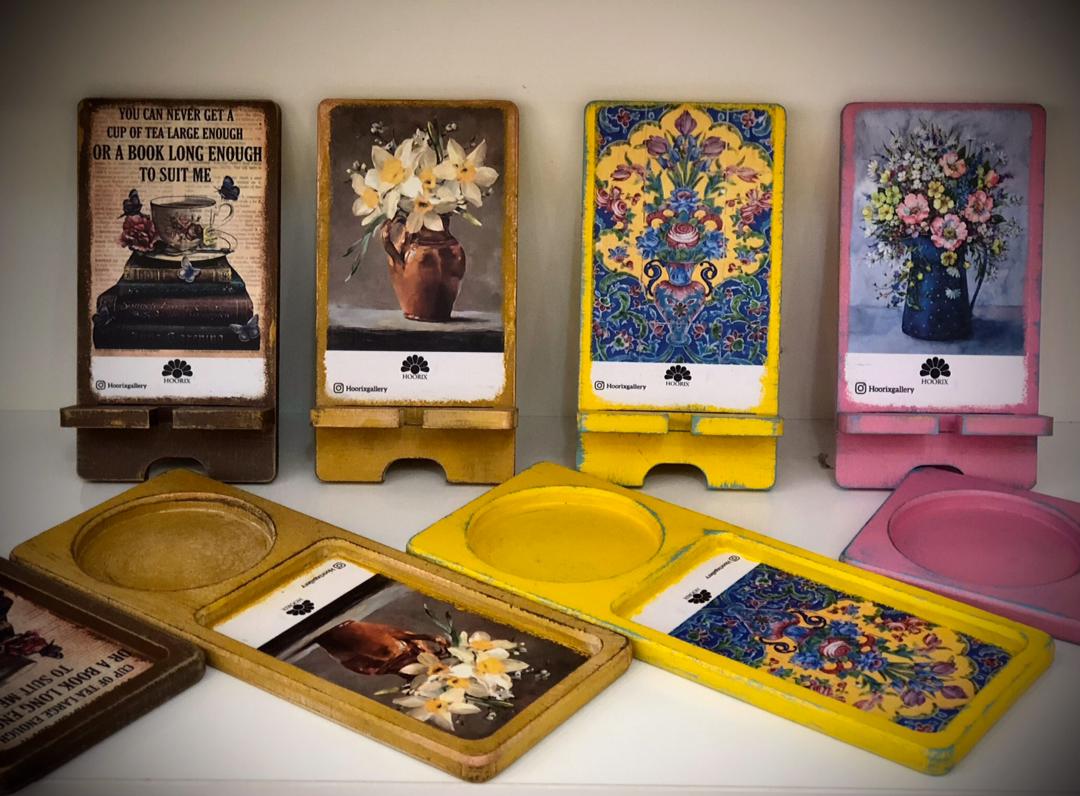 ست استند موبایل و زیر لیوانی در طرح ها و رنگ های متنوع ساخته شده با سبک دکوپاژ و پتینه یک وسیله بسیار کاربردی در محل کار و منازل شما