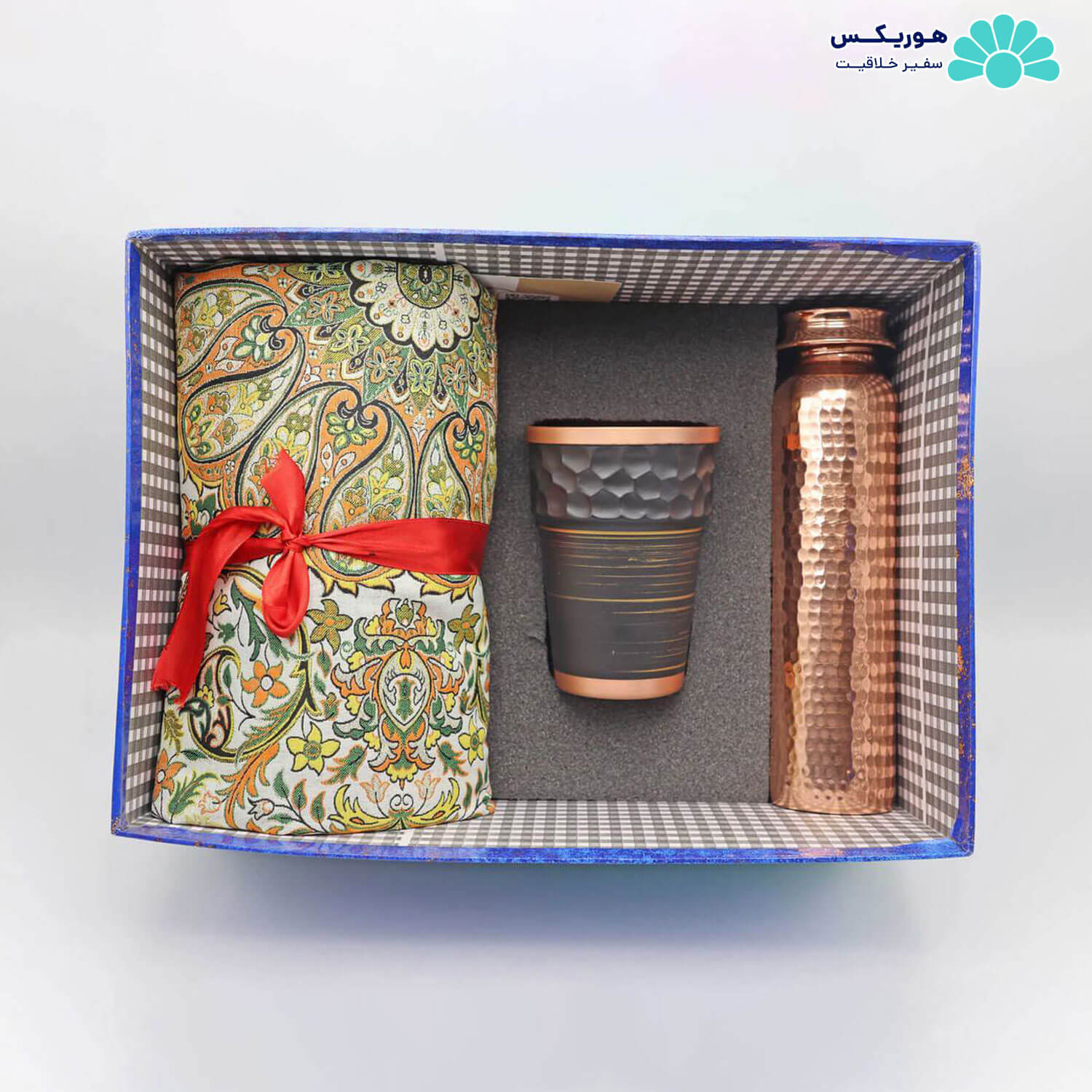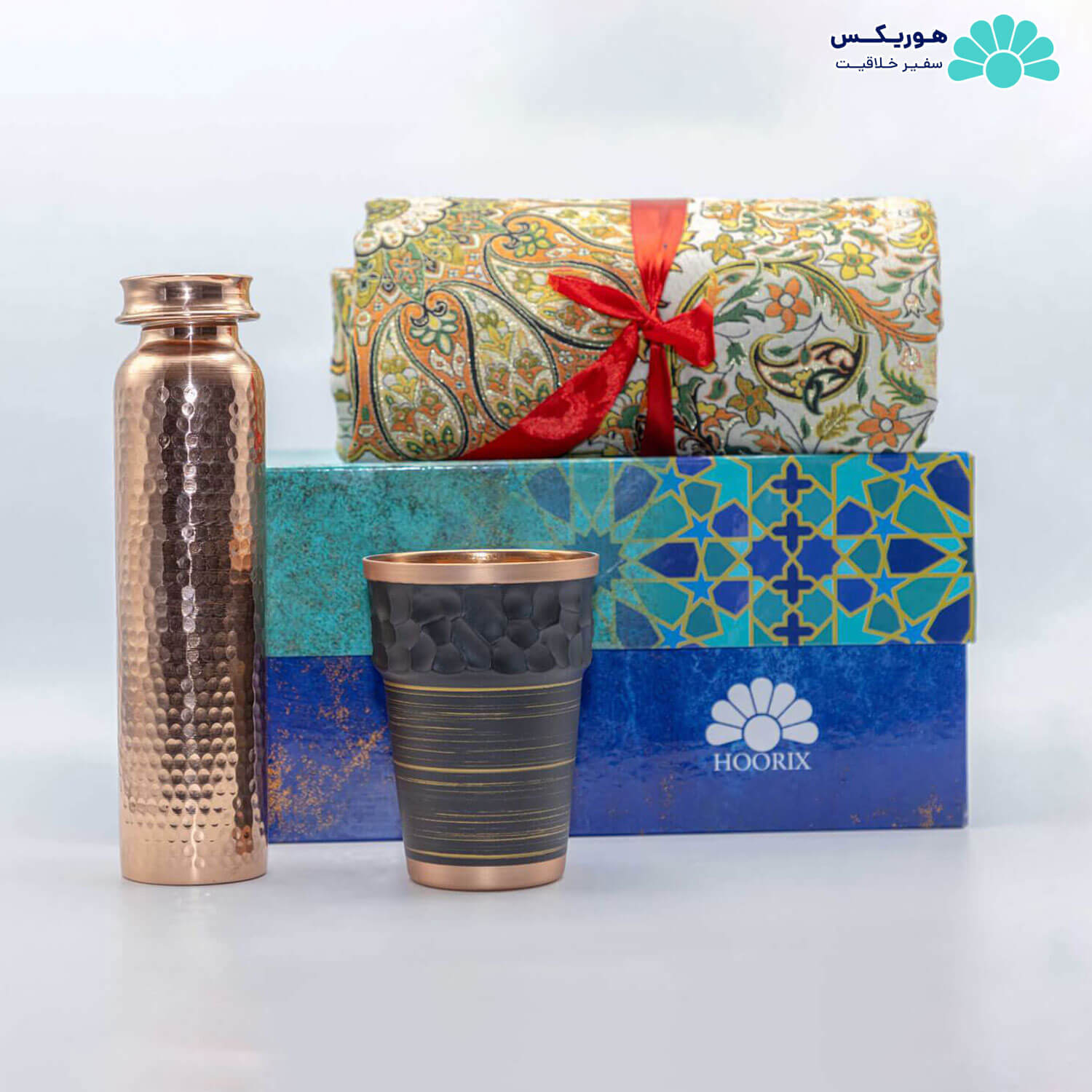 | ابعاد | بطری مسی: ۵×۶×۲۴ سانتیمتر ترمه (۹۷×۹۷ سانتیمتری): ۹۷×۹۷ سانتیمتر ماگ مسی: ۶×۹×۱۳ سانتیمتر |